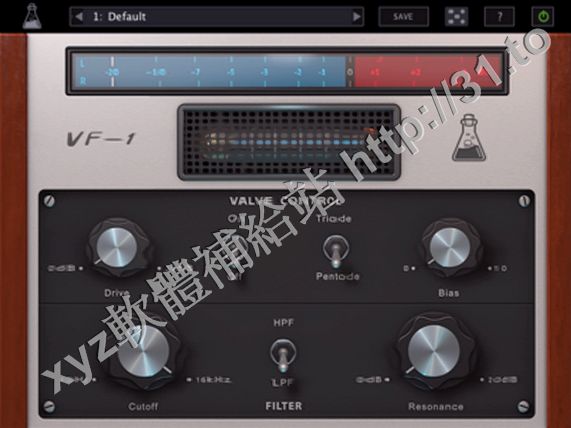 閥過濾器VF-1是多模諧振濾波器插件與古董閥仿真。過濾器後部分是模仿經典階梯濾波器低通和高通模式。閥門部分是倣傚古典Telefunken ECC83管,但增加了勇氣和定制的增益控制。